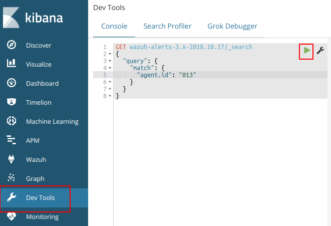 Try to fetch data directly from Elasticsearch for the today’s index and for the agent 013. Copy and paste the next query in the Kibana dev tools: