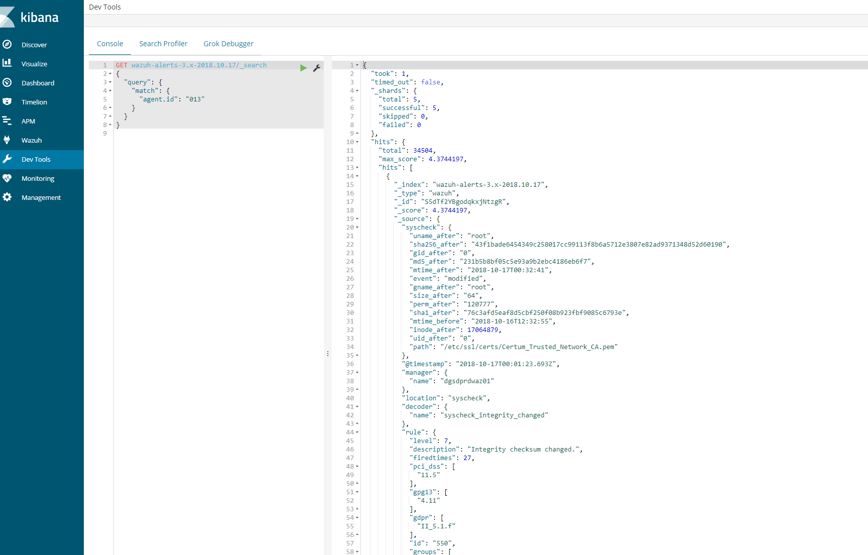 GET wazuh–alerts–3.x–2018.10.17/_search{ “query”: { “match”: { “agent.id“: “013” } }}