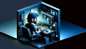 DALL·E 2024-03-13 23.04.51 – A cartoon image of a tech nerd with long hair, depicted in a 3D perspective, working late at night on his PC, positioned far to the left side of the r